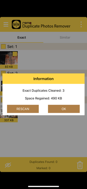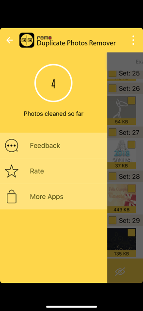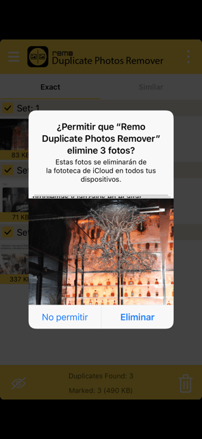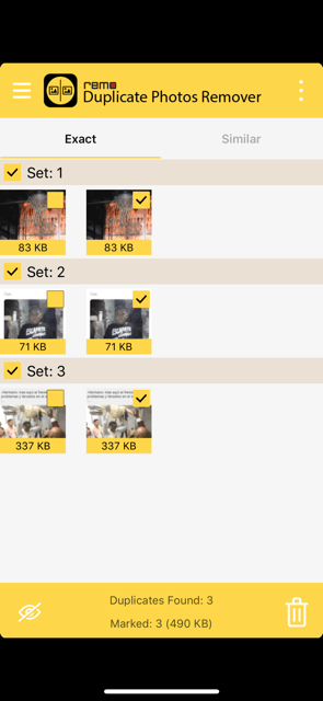 Remo no sólo seleccionar las fotos en exacta similar fino que en cada columna las clasifica en Sets, donde cada uno de estos sets es un compendio de todos los duplicados o similares, según sea el caso. Esto es especialmente útil en el caso de los duplicados exactos porque la aplicación permite elegir la casilla amarilla del set y con esto se marcarán para eliminación todos los duplicados dejando sólo la primera foto, que para los efectos de la aplicación, entiende que es la original. De todos modos podemos hacerlo manualmente, eligiendo foto por foto. Otra ventaja de esta aplicación es que para decidir cuál es la foto que queremos conservar, principalmente útil en el caso de las similares, sólo tenemos que tocar una de las fotos para desplegar una vista previa, y al desplazarnos de un lado a otro sólo veremos la previsualización de las fotos contenidas dentro de ese set, lo que nos ayudará a no cometer errores al ahora de borrar los duplicados exactos o similares.